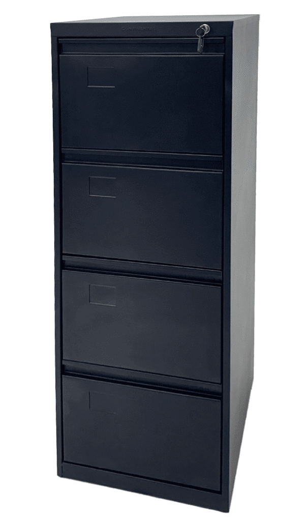 Archivero importado de 4 gavetas. Metal sometidos a tratamiento especial de limpieza y desengrase, más un «Proceso de Fosfatización» para una perfecta adhesión de la pintura electrostática (fluido de polvo seco) curada o secada al horno; con lo que se obtienen excelentes resultados tanto en términos de acabado como en sellado herméticoanticorrosivo.