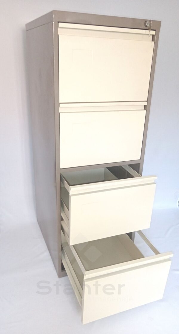 Archivero metálico de 4 gavetas con porta carpetas. Mueble sometido a tratamiento especial de limpieza y desengrase, más un «Proceso de Fosfatización» para una perfecta adhesión de la pintura electrostática (fluido de polvo seco) curada o secada al horno; con lo que se obtienen excelentes resultados tanto en términos de acabado como en sellado hermético anticorrosivo.
