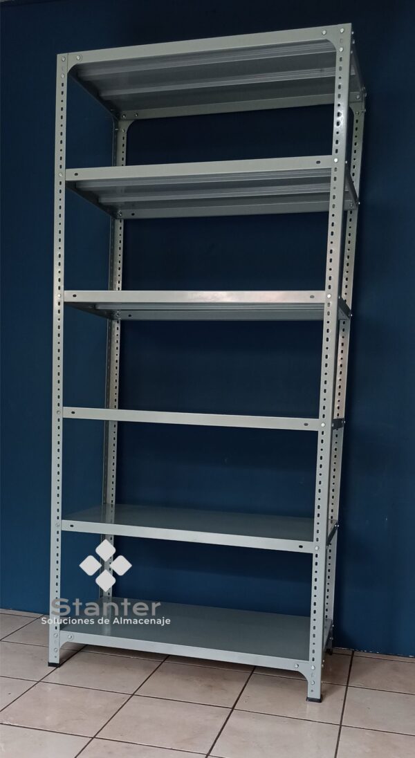 Estante metálico de 06 niveles Compuesto de Anaqueles fabricados con lamina de acero calibre 1/32″ y parales de ángulos ranurados calibre 1/16″ Estos son sometidos a tratamiento especial de limpieza y desengrase, más un «Proceso de Fosfatización» para una perfecta adhesión de la pintura electrostática (fluido de polvo seco) curado o secado al horno; con lo que se obtienen excelentes resultados tanto en términos de acabado como en sellado hermético.