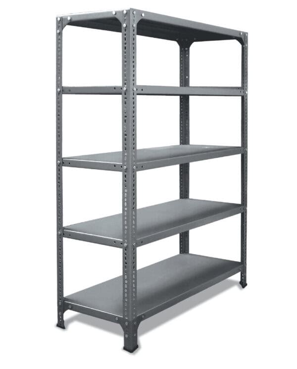 Estante dexion de 05 niveles Compuesto de Anaqueles fabricados con lámina de acero calibre 1/32″ (0.70mm) parales de ángulo ranurado calibre 1/16″ (1.6mm). Estos son sometidos a tratamiento especial de limpieza y desengrase, más un «Proceso de Fosfatización» para una perfecta adhesión de la pintura electrostática (fluido de polvo seco) curada o secada al horno; con lo que se obtienen excelentes resultados tanto en términos de acabado como en sellado hermético