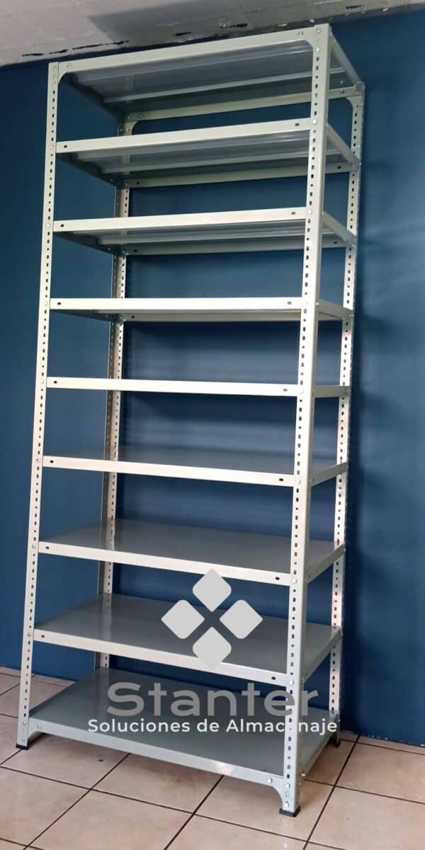 Estante metálico de 09 niveles Compuesto de Anaqueles fabricados con lamina de acero calibre 1/32″ y parales de ángulos ranurados calibre 1/16″ Estos son sometidos a tratamiento especial de limpieza y desengrase, más un «Proceso de Fosfatización» para una perfecta adhesión de la pintura electrostática (fluido de polvo seco) curado o secado al horno; con lo que se obtienen excelentes resultados tanto en términos de acabado como en sellado hermético.