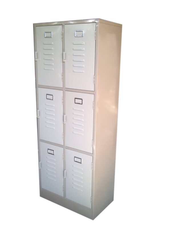 Lockers metálicos de 6 compartimentos, con porta candados. Fabricado en lamina calibre 1/32″; mueble sometido a tratamiento especial de limpieza y desengrase, más un «Proceso de Fosfatización» para una perfecta adhesión de la pintura electrostática (fluido de polvo seco) curada o secada al horno; con lo que se obtienen excelentes resultados tanto en términos de acabado como en sellado hermético.