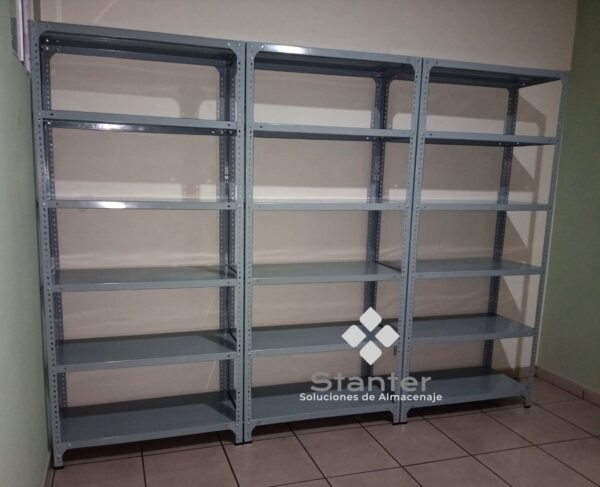 Módulo de estantes metálicos de 06 niveles. Compuesto de Anaqueles fabricados con lamina de acero calibre 0.60mm. Parales calibre 1.60mm Estos son sometidos a tratamiento especial de limpieza y desengrase, más un «Proceso de Fosfatización» para una perfecta adhesión de la pintura electrostática (fluido de polvo seco) curado o secado al horno; con lo que se obtienen excelentes resultados tanto en términos de acabado como en sellado hermético.