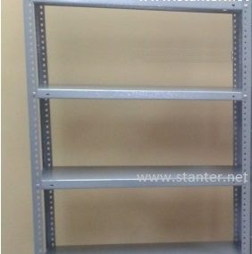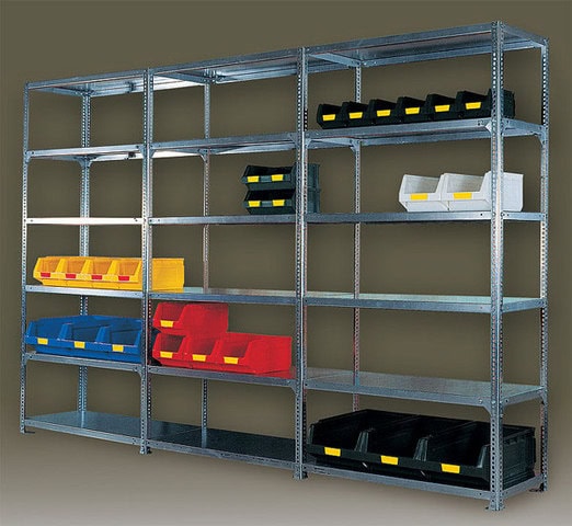 Módulo de tres estantes metálicos con angulares compartidos. Compuesto de 18 anaqueles fabricados con lámina de acero calibre 1/32″ (0.60mm) con parales de ángulos ranurados calibre 1.6mm. Estos son sometidos a tratamiento especial de limpieza y desengrase, más un «Proceso de Fosfatización» para una perfecta adhesión de la pintura electrostática (fluido de polvo seco) curado o secado al horno; con lo que se obtienen excelentes resultados tanto en términos de acabado como en sellado hermético.